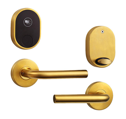 Электронный замок для гостиниц HSU-9902-G раздельным блоком считывателя (контроллера) и ручками, выполнен в цвете матовое золото. В комплекте с замком имеются уплотнительные резинки под блок считывателя и батарейный отсек, ручки. Это обеспечивает дополнительную устойчивость к воде и пыли, позволяет производить установку электронного замка для гостиниц на уличных дверях.