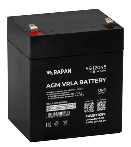 Аккумулятор герметичный свинцово-кислотный необслуживаемый RAPAN SB 12045 c пониженным внутренним сопротивлением производится по технологии AGM (Absorbent Glass Mat) с системой рекомбинации газов VLRA и предназначен для использования в составе системы резервного питания.