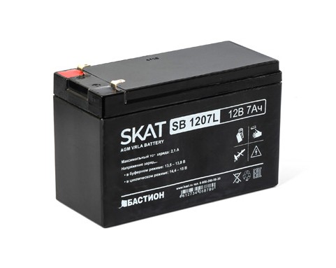 Бастион SKAT SB 1207L — герметичный свинцово-кислотный необслуживаемый аккумулятор 12 В, ёмкостью 7 Ач. Он произведён по технологии AGM с системой рекомбинации газов VLRA и предназначен для использования в составе системы резервного питания.