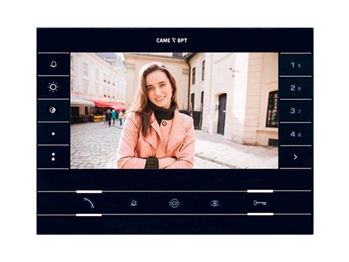 На левой стороне дисплея находятся кнопки регулировки/отключения звонка, регулировки контраста и яркости и две дополнительные кнопки, а на правой – кнопки, позволяющие совершать до 8 вызовов по интеркому. В нижней части хорошо видны 5 кнопок основных функций: приема вызова, отключения звонка, принудительного просмотра видео с вызывных панелей, кнопка «Паника» для связи с консьержем и кнопка открытия двери. Доступны функция Master/Slave и функция переадресации видео между абонентскими устройствами при одновременном вызове. В комплект входит суппорт для настенного монтажа на распределительную коробку 503 (горизонтально или вертикально) и на круглую коробку ∅ 60 мм. Оборудование совместимо с технологиями X1 и XIP.