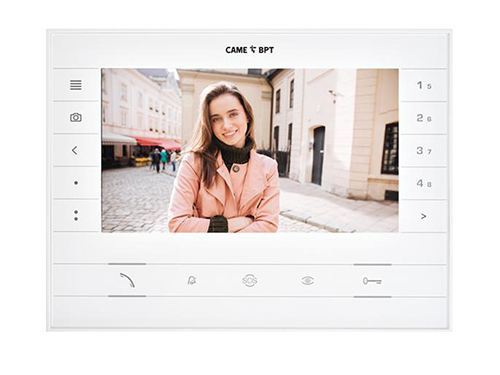 На левой стороне монитора находятся кнопки активации экранного меню, включения автоответчика (фотофиксации посетителей), навигационная кнопка и две дополнительные кнопки, а на правой – кнопки, позволяющие совершать до 8 вызовов по интеркому. В нижней части хорошо видны 5 кнопок главных функций: приема вызова, отключения звонка, принудительного просмотра видео с вызывных панелей, кнопка «Паника» для связи с консьержем и кнопка открытия двери.