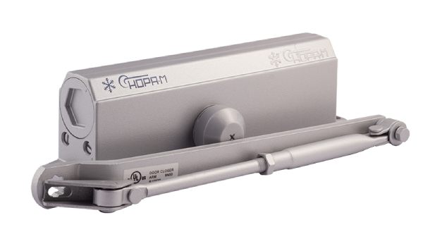 НОРА-М 5S - доводчик дверной морозостойкий, предназначен для установки на входные металлические и другие тяжёлые двери (весом от 120 до 160 кг). Скорость закрывания двери при установке может быть отрегулирована в диапазонах от 180° до 18° и от 18° до 0° при помощи винтов на корпусе доводчика.