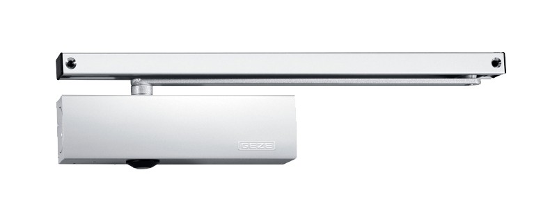GEZE TS 3000V — универсальный дверной доводчик верхнего расположения со скользящей шиной для одностворчатых дверей с правым и левым упором.