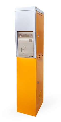 Основной элемент автоматизированного выездного терминала. Она обеспечивает полную автоматизацию процедуры выезда с парковки. Корпус стойки выполнен из стали с надежным всеклиматическим покрытием порошковой эмалью оранжевого цвета (RAL 2000). Передняя панель стойки изготовлена из нержавеющей стали.