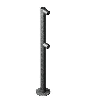 OMA-02.361.A0 — окрашенная боковая стойка ограждения на фланце с 2 муфтами под поручни, часть металлического заграждения. Такие ограждения представляют собой модульные конструкции и устанавливаются на проходной с турникетами, формируя зону прохода и препятствуя свободному проникновению внутрь.