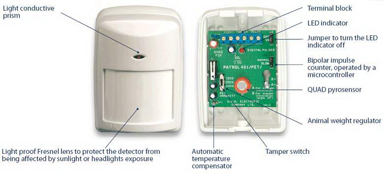 Алгоритм работы GSN PATROL-401PET, основанный на биполярном счётчике импульсов и управляемый микроконтроллером, безошибочно выявляет перемещение человека в охраняемом помещении, полностью исключает возможность ложного срабатывания, одновременно обеспечивая стабильную работу извещателя в самых сложных условиях. Не реагирует на 10-ваттный передатчик в частотном диапазоне от 10-1000 МГц в пределах одного метра. Герметически изолированный пироэлектрический сенсор защищён от воздействия воздушных потоков и насекомых, что практически полностью ликвидирует главный источник ложного срабатывания извещателя.