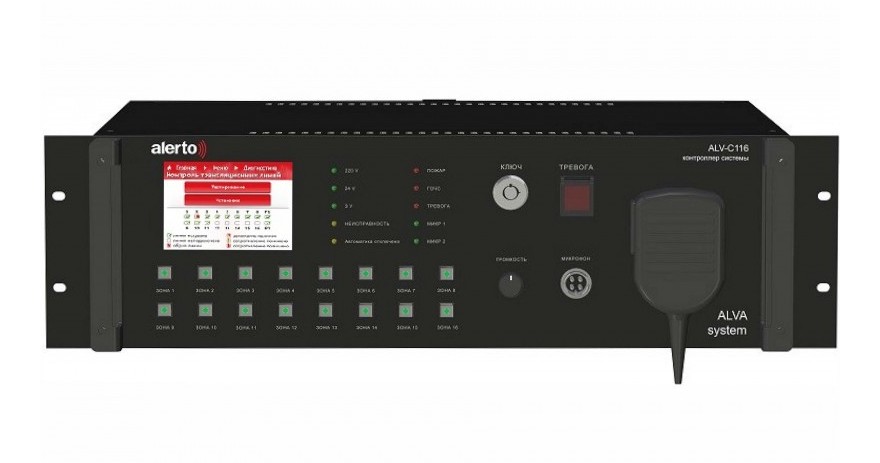 Alerto ALV-C116 — контроллер системы оповещения, является центральным элементом ALVA system. Обеспечивает трансляцию сигналов, тревожных сообщений, команд диспетчера и музыкальных файлов по 16 зонам трансляции в соответствии с текущим режимом работы, в том числе по программируемым сценариям эвакуации. Подключение к системе ОПС, блоку сопряжения с системой ГОЧС. Выполняет контроль исправности линий связи. В зонах оповещения могут применяться аттенюаторы, отключаемые по сигналу контроллера. Настройка выполняется с помощью программного обеспечения при подключении ПК. Файлы голосовых сообщений записываются в формате МР3 в память контроллера (до 250 шт) и практически не ограничены по размеру. Возможно создание 16 гибких сценариев эвакуации. Максимальная подключаемая нагрузка до 3 кВт (6 усилителей ALV-PA500).