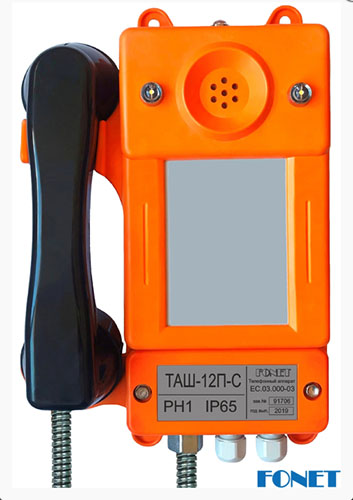 Общепромышленный телефонный аппарат ТАШ-12П-С без номеронабирателя, со световой индикацией вызова предназначен для обеспечения устойчивой телефонной связью производственных зон и открытых площадок, на предприятиях в условиях машиностроительного, металлургического и химического производств, горнодобывающих и рудных разработок. Аппарат может быть использован на объектах транспорта – железнодорожных станциях, аэропортах, метрополитенах, тоннелях.