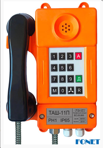 Общепромышленный телефонный аппарат ТАШ-11П с номеронабирателем предназначен для обеспечения устойчивой телефонной связью производственных зон и открытых площадок, на предприятиях в условиях химического, машиностроительного и металлургического производств, а также горнодобывающих и рудных разработок. Аппарат может быть использован на объектах транспорта – железнодорожных станциях, аэропортах, метрополитенах, тоннелях.