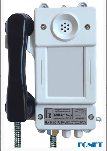 Телефонные аппараты ТАШ-12ЕхС-С взрывозащищенные без номеронабирателя, со световой индикацией вызова предназначены для обеспечения устойчивой телефонной связью производственных зон и открытых площадок, имеющих опасность возникновения взрывоопасных сред. Применяются только в комплекте с барьерами БИТ-Е в прямой телефонной связи во взрывоопасных зонах, системах телефонной связи БИТ-16 и в комплексах производственно-технологической связи КПТС-5.